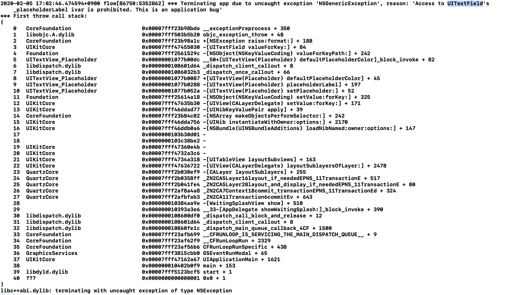 응?? 잘은 모르겠지만 UITextField's _placeholderLabel 에 엑세스 하려고 했고 그건 금지라는 것같다.